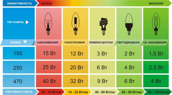 Светильник с высокой световой эффективностью потребляет меньше электроэнергии и служит дольше, чем светильник с низкой световой эффективностью. Светодиодные лампы могут производить больше света при меньшей мощности.